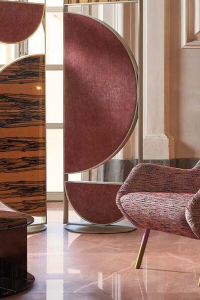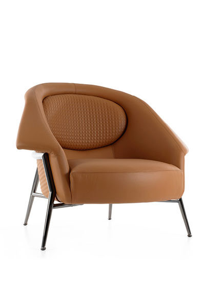 The structure of this striking armchair is in steel covered with polyurethane foam that was given different densities to guarantee a comfortable seating experience. The design is enveloping and modern, creating a welcoming piece that is also striking to behold, with armrests and back being a single line that bends around the seat. The fabric upholstery is in elegant dark grey and is entirely removable for easy care.